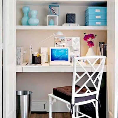 The method for doing this is by removing the door and trading hanging rods for shelves – of which you will need a deep one for the desktop and two shallow ones above for storage. The materials used in the above picture are white melamine shelves, metal standards, and shelf brackets.