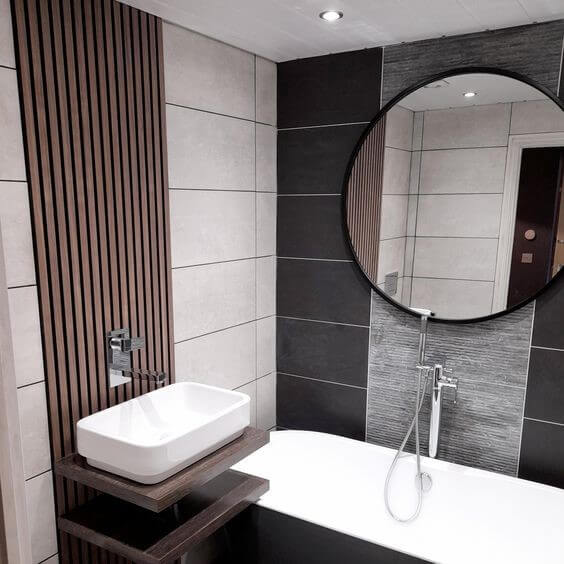 (Water resistant) wood panelling is one way to achieve this luxurious look. In this picture each wood panel is 2400mm long, (the common length for most British ceiling heights with no joins). The creator of this product also made a unique ‘felt like’ backing material made from discarded plastic bottles, which offers acoustic and insulative features.